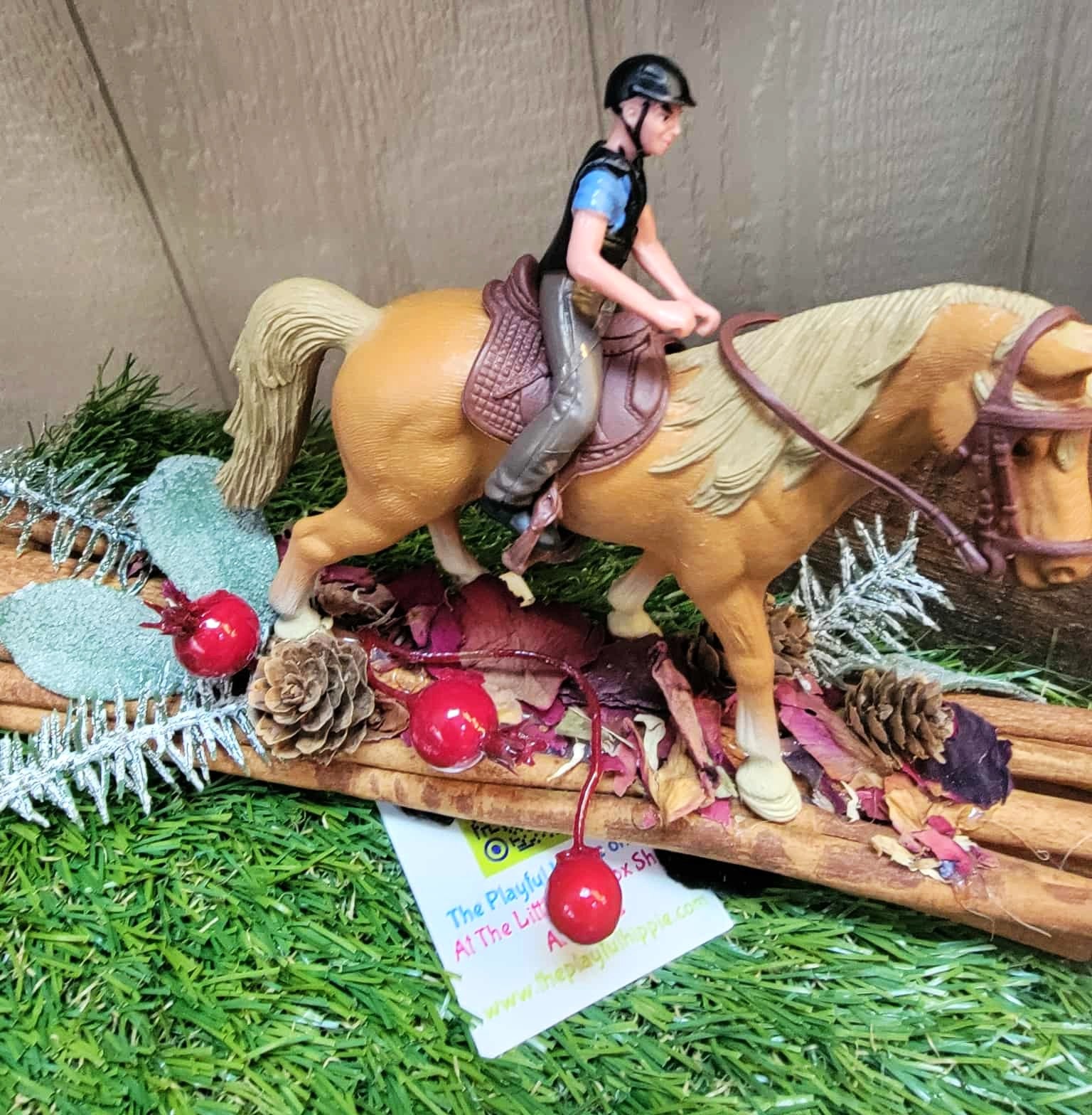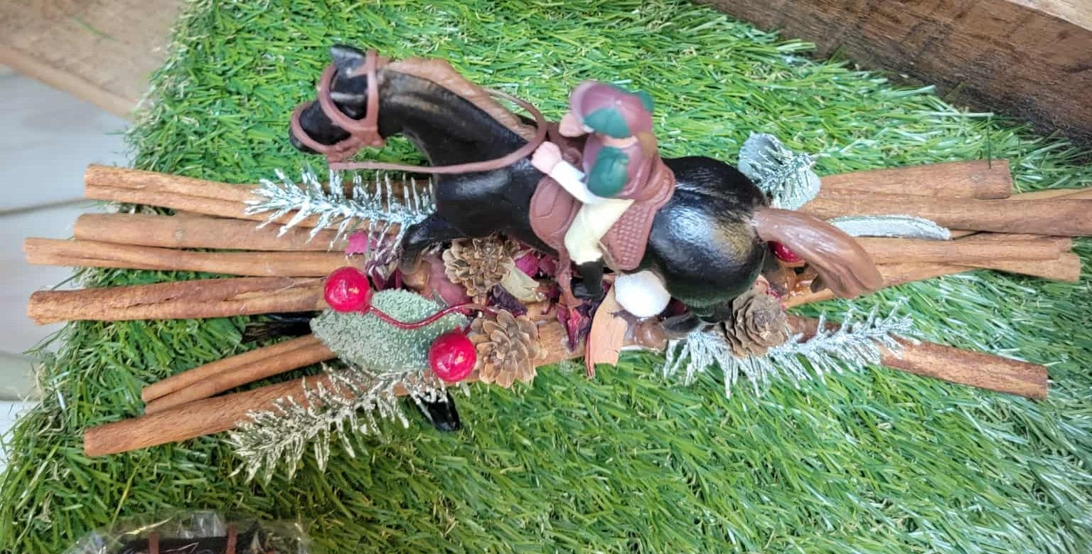 A fragrant bundle of Cinnamon Sticks, Holly, Moss, Cones, and Potpourri making a trail for a Horse and Rider headed into the woods for the hunt.